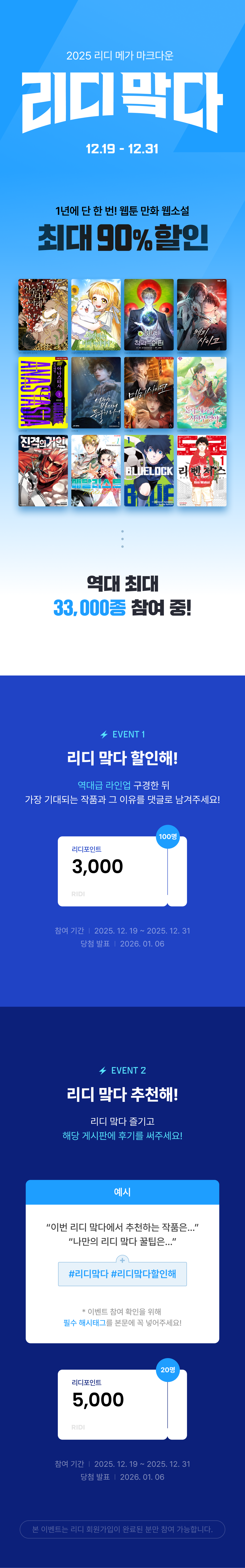» ๋งˆ๊ฐ [๐Ÿ’™๋ฆฌ๋”” ๋ง ๋‹ค๐Ÿ’™] 1๋…„์— ๋‹จ ํ•œ ๋ฒˆ! ์›นํˆฐ ๋งŒํ™” ์›น์†Œ์„ค ์ตœ๋Œ€ 90% ํ• ์ธ ๋ฆฌ๋”” ๋ง ๋‹ค ์ด๋ฒคํŠธ 282 2025.12.19 15857
